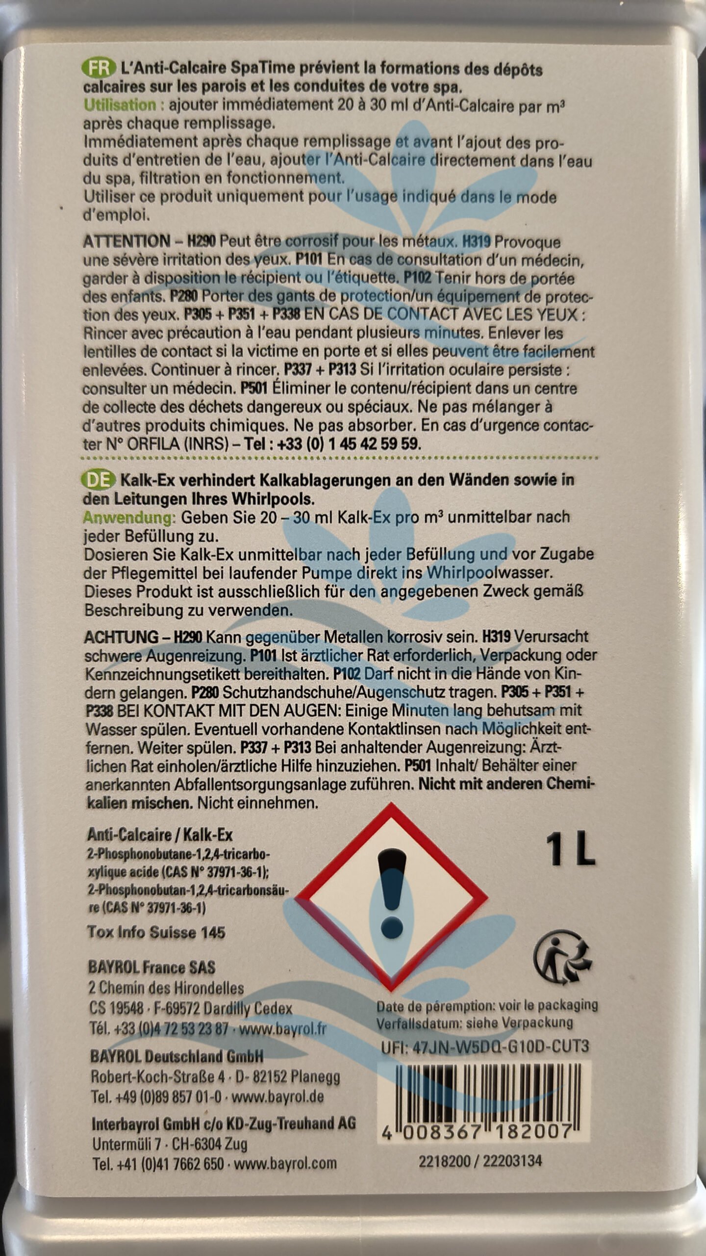 L’Anti-Calcaire évite les taches et empêche l’eau de se troubler. Il est résistant au chlore et sans phosphate.