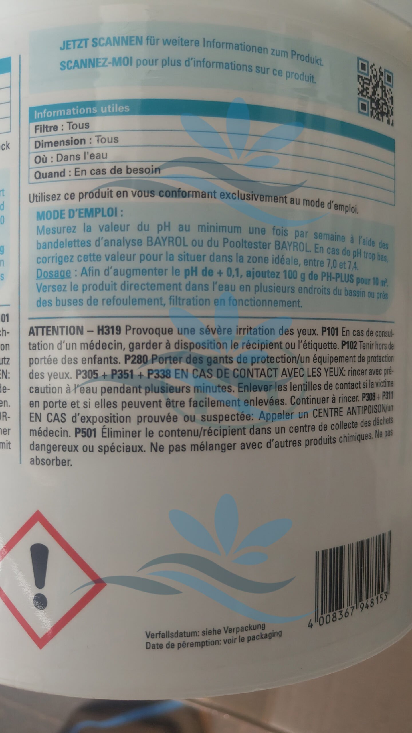 Pour elever la valeur de pH de +0,1, utiliser 100 g pour 10 m³ d’eau.